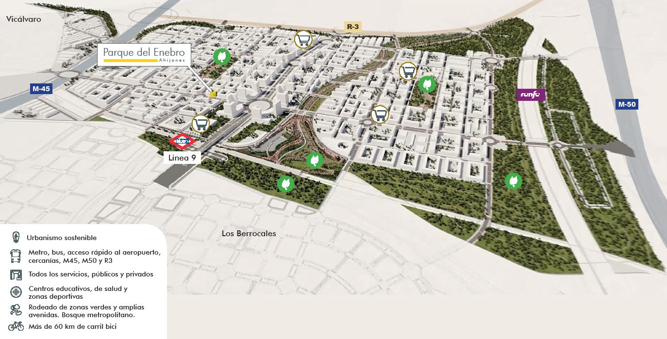 Los Ahijones será uno de los principales barrios de la ciudad de Madrid, ubicado en la zona de los Desarrollos del Este e integrado en el proyecto municipal del Bosque Metropolitano.