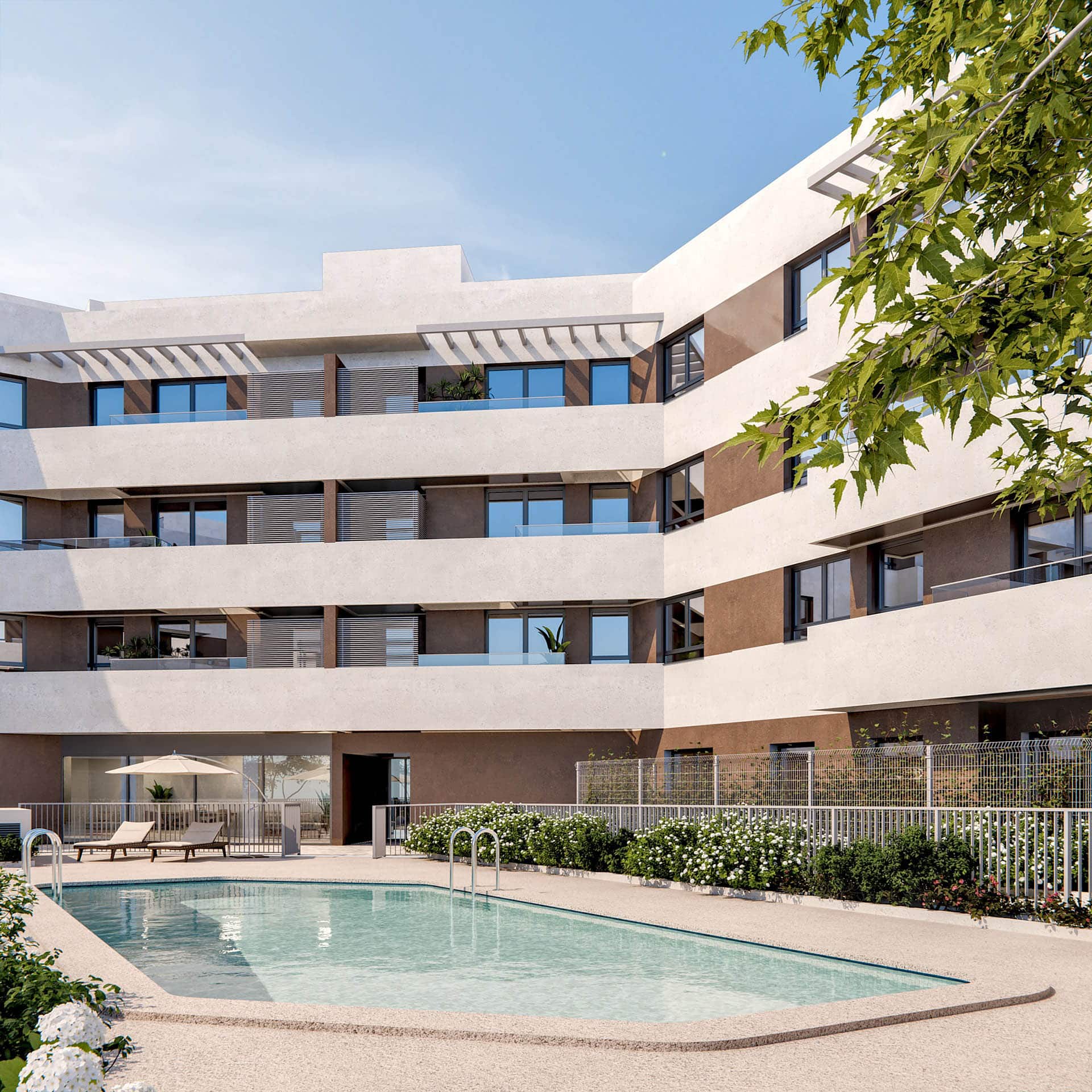 – Diseño moderno y eficiente: viviendas de 2 y 3 dormitorios con terraza, piscina, zonas comunes ajardinadas y calificación energética A.
