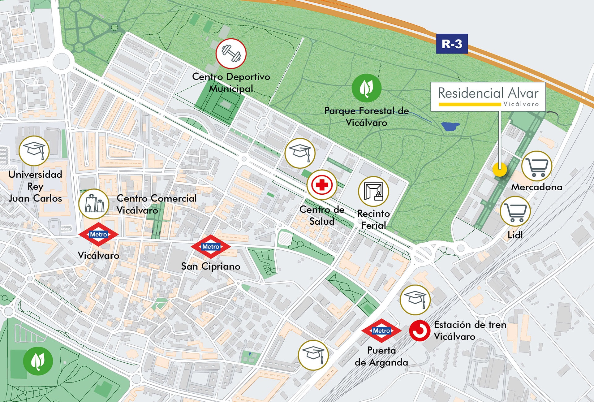 En “Residencial Alvar” podrás disfrutar de la tranquilidad de un ambiente residencial rodeado de parques y áreas verdes, que está perfectamente conectado al corazón de Madrid gracias a su excelente red de transporte tanto público (Cercanías, Metro y autobús), como privado.