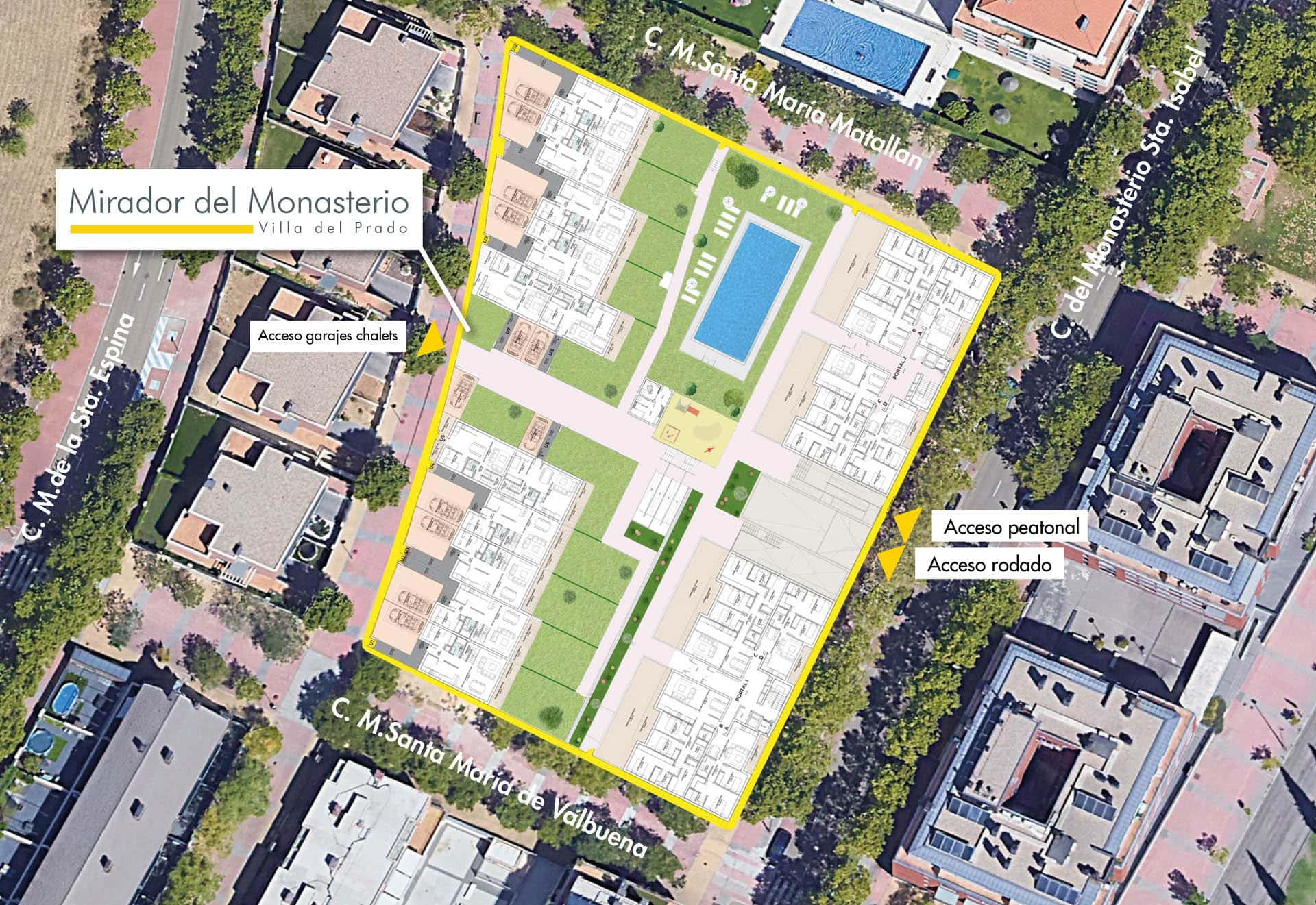Mirador del Monasterio es una promoción compuesta por 32 viviendas en altura de 2, 3 y 4 dormitorios y 12 viviendas unifamiliares de 4 dormitorios con jardín privado y magníficas zonas comunes en una urbanización cerrada.