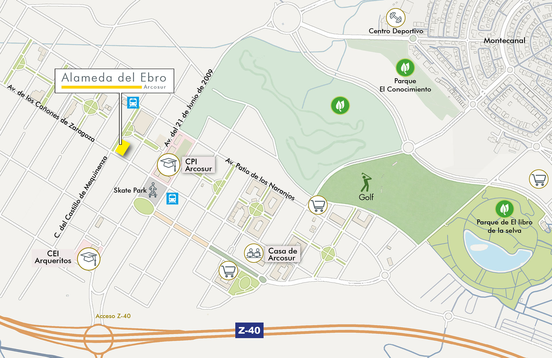 El residencial se encuentra ubicado en el centro de ARCOSUR, un barrio joven con buena calidad de vida que cuenta con todo tipo de servicios y bien comunicado con la Z-40 y la conexión de autobús al tranvía.