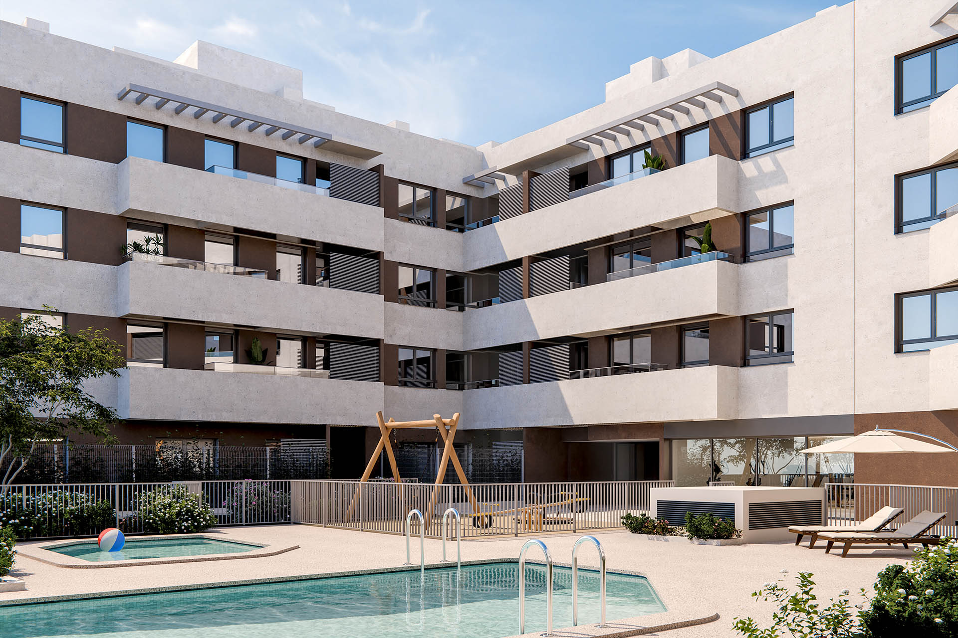 – Diseño moderno y eficiente: viviendas de 2 y 3 dormitorios con terraza, piscina, zonas comunes ajardinadas y calificación energética A.